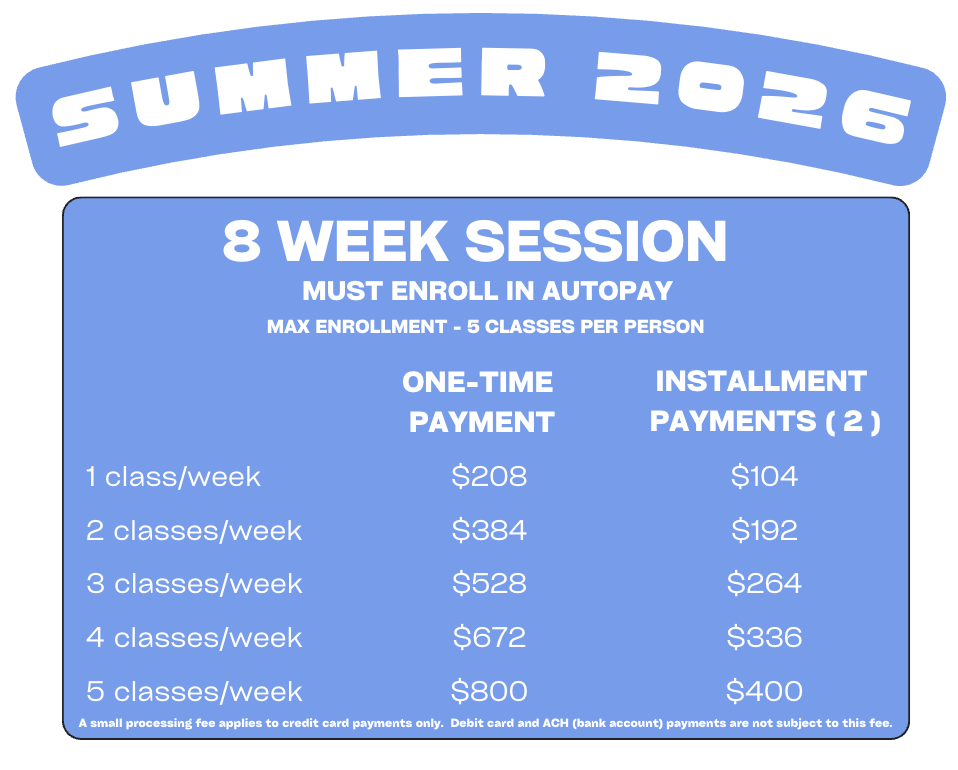 Tuition includes a $35 Annual Registration Fee, charged annually in August. New students are charged ARF the first time attending our studio.